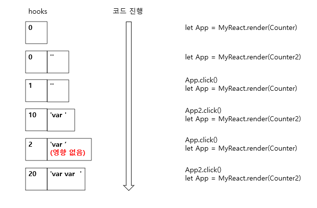 // hooks 배열에는 가장 최근에 setState 된 값들이 저장되는 것이다.